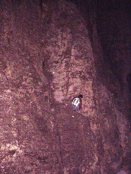 After the mucho problemas on the various rappels Bill is just about ready to land at the base. After a few beers we put on the headlamps and started the march outta there. Trail finding was kinda tough with our puny Tikkas, but all roads were leading to Rome and we had a fairly uneventful death march back to the parking area.