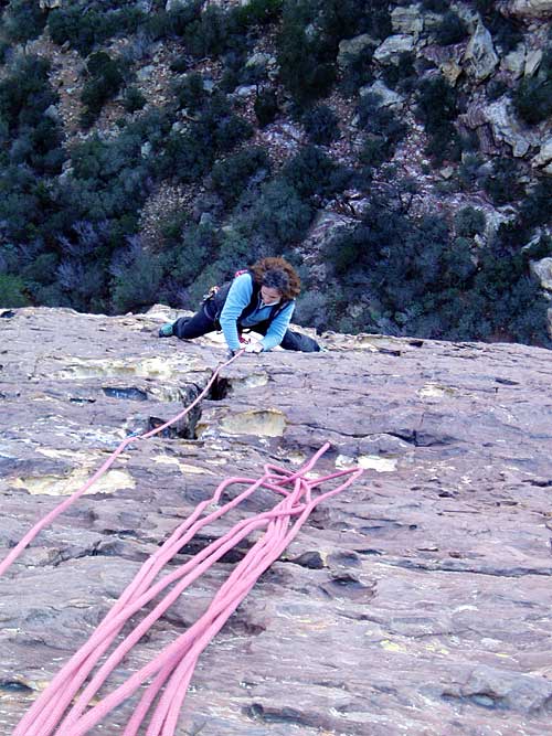 This is Susan following a pitch near the top. This one actually had some crack climbing on it instead of just using the crack as a route finder while clipping bolts. You can run this pitch and the one below it into one monster pitch with maybe one or two bolts, an anchor in the middle, then half a pitch of crack to the next station. Not sure if we had to simo on the pitch or not.... but I did place a biner as a nut on the pitch right here at the top. Turns out I did not need it as the move I was protecting was easy, but getting the perfect biner slot almost killed me.