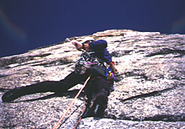 From beneath, this soaring golden headwall appeared to have a "Harding" type slot. Once upon it, this was hardly the case. Instead, after a short face traverse, I was confronted by a shallow bottoming groove. Initially easily tamed by hand jams, the groove started tapering and thinning to a mere shallow trough. The slot was interspersed with some O.K. pro, yet the rock was always crystalline, its teeth claiming much skin. Halfway out my next lead, with a string of junk pro behind me, a similar trough now confronted me.