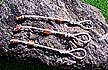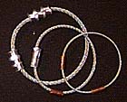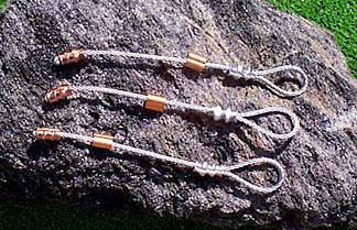 These rivet hangers are made to Nicopress specifications and are of the cinch loop design. We offer three sizes, #1 at 1/16th of an inch cable, #2 at 3/32nds of an inch cable, and #3 at 1/8th of an inch cable. Use the #1 size on maximum dice, #2 size for virtually all rivets encountered on most wall routes. The #3 size is for putting over substantial rivets or bolt studs, perhaps at an anchor, or for whipping out when you are really scared on monster rivet ladders. $3.00 ea.