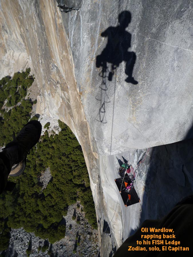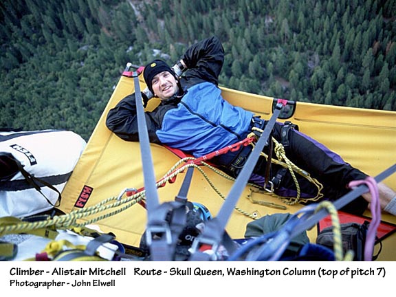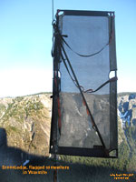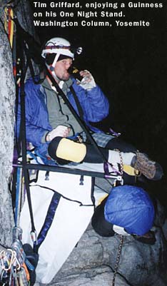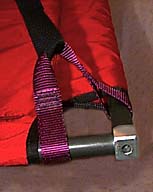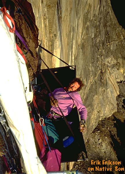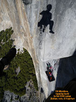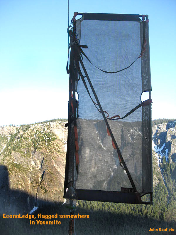 TIPS: If bad weather is certain, be sure to bring a bivy sack along to keep the condensation on the walls of your rainfly from getting you and your sleeping bag wet. Always seek out a steep place to hang your ledge and stay away from any runnels, for they can easily become raging torrents during a mild rain storm. Thoroughly inspect your ledge before every outing. Seam sealer can peel off over time, a cut might appear in the fly from unknown sources, or the shock cord in the ledge might need to be replaced. Find out what the problems are on the ground --- then fix them on the ground. It's hard to find a new shock cord half way up Mescalito. When using the fly on any of our ledges, be sure the rear lock downs are in place before putting your weight into the ledge. This way the fly is protected from any possible wear against the wall during set up. A general maintenance routine will ensure years of service from you ledge. Keep it 'sano! |