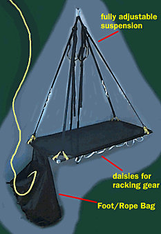 your size 12's and a 30 below sleeping bag. Sounds cool so far, but get this: The foot section can hang down to make the best rope bag any retentive wall climber has ever seen and is big enough to hold two ropes, maybe your jackets, some food, or the Ghetto blaster. When the foot bag is not being used, either roll it up and stow it under the ledge or use it as a pillow while lounging. Added luxuries include a super strong bed that is as burly as heavy weight RBS (similar to the stuff we make our haul bags from) but dig this: It's a lightweight mesh! What does this mean for you? Since it is a mesh, air can flow up and through the bed to keep you cool as you lounge all day in the sun. And what if it rains? Well, since you brought your bivy sack, just lay down and let all the water drain quickly through the mesh. No laying in a "bathtub" hammock begging for a snorkel. We put full length daisy chains on the inside and outside rails for gear management and get this: The 4 point suspension quickly turns into a 6 point suspension so you and your hefty buddy can both sit down and rack gear or just share a splendid moment. The One Night Stand is made for rough handling and is not some delicate fluff apparatus. This item legitimately kicks ass. Comes complete with its own hauling bag made from our burly haul bag fabric.