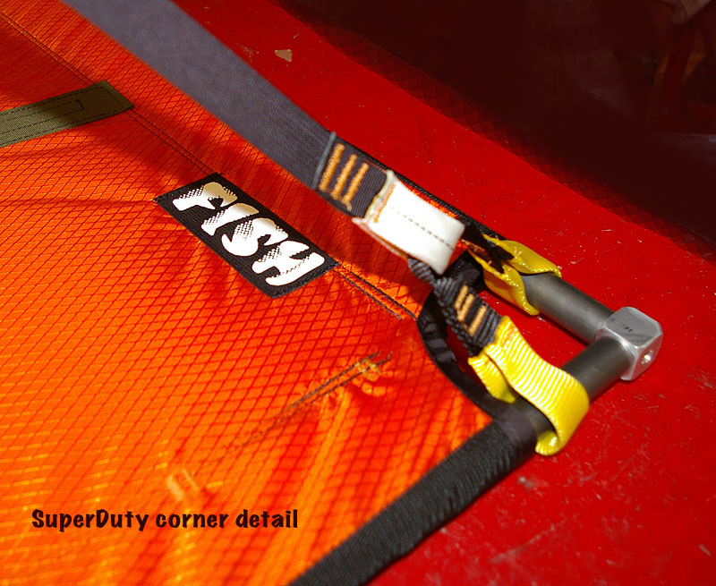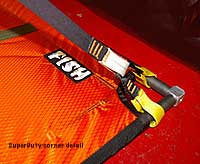 This feature packed ledge is the best choice for any Big Wall hopeful. Our super stable ledge was designed around machined 6061 aluminum corner pieces coupled with 4130 Cro-Moly tubing for strength. The suspension system is easy to adjust even when weighted and sports an easy to manage 12 adjustment buckles (1/2 metal, 1/2 Fastex) for strength and superior adjustablility. The six additional adjustment buckles we added down low allow you to fine tune your setup from inside your sleeping bag. Our suspension also features 6 sewn in daisy chains for personal gear management at the bivy, and one center hanging daisy for clipping in your stove, lantern, or wet socks. The bed on our ledges is fully taped 420 denier pack cloth, grommeted for condensation drainage, and is a roomy 42" wide and a full 6'5" long. The FISH 5-Season portaledge rainfly features: Double urethane coated fabric for maximum waterproofing, fully protected against wear with 18oz. Vinyl RBS fabric on the wall side and on the front corners, numerous lash loops around the bottom edge to subdue fearsome updrafts and is internally poled with an expedition tough 7075 Easton aluminum wand for maximum room inside during storms. It even has a 12" diameter port hole for vapor management. For the true thrill seeker you can even do your business out of this hole (whatever that is). The larger overall size of our ledge and rainfly, compared to others, also gives you more internal room for yourself and any other items that must be inside during a storm. All FISH portaledges come with their own hauling bag made from a tough and durable material similar to that used in our haul bags. This setup is intended to be clipped under your haul bag which makes the ledge not only easier to get to at the end of the day, but also frees up some space in the seemingly always full haul bag. Included are easy to follow instructions that will have you setting this baby up in about one minute. At last, the torment has ended.