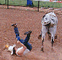 The fellahs cinched up the strap running over the man post of the bull and waited for me to give them a go sign. "Hit it!" I blurted and the chute sprung open. I rode that beast for nearly an hour and then finally, due to fatigue, I hopped off onto my head. The fellahs hustled the bull away and helped me to get up. They told me that was the best 2 second ride they had ever seen.