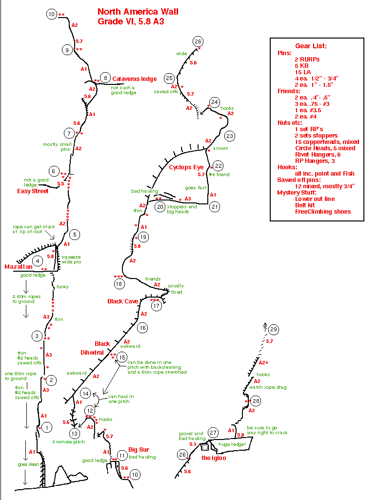 Pitch 11 will take you to Big Sur, a fine ledge and bivy site. The hauling onto this ledge can be grim, so be forewarned and try to set a high hauling anchor if possible. Pitch 13 used to be called "The Rubberband Man" pendulum and takes about 5 minutes for the pitch. Once you get over to the end of the penji, there is a big loose block just above the belay (maybe?) This should not be touched. The next two pitches can be run together if you have a 60m rope and do a lot of backcleaning. The regular anchor for pitch 14 has no bolts and is a stop where you can affair.